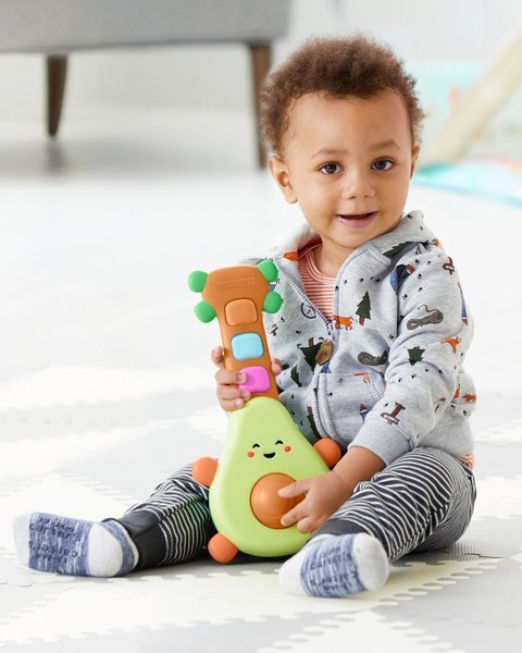 Музыкальная игрушка Skip Hop, цвет Avocado Guitar — привлечет каждого малыша звуками, имитирующими гитару, светящимися кнопками и очаровательной улыбкой! Удобная для маленьких рук. Помогает развить моторику и отлично стимулирует зрение и слух. При нажатии кнопок звучит музыка и звуки (6 песен и 6 звуков, имитирующих гитару). Работает от 3 батареек ААА