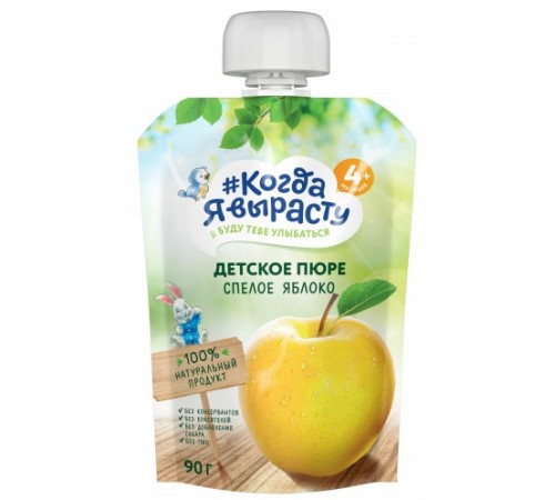 Фруктовое пюре «Когда Я Вырасту» Спелое яблоко — это сбалансированный и полезный детский десерт, рекомендован для питания детей старше 4 месяцев. Пюре — излюбленный перекус не только малышей и деток постарше, но и школьников, подростков, взрослых поддерживающих здоровый образ жизни.
