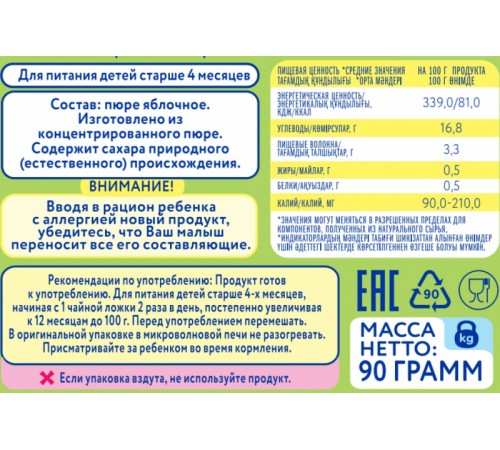Состав: пюре яблочное. Гомогенизированное, стерилизованное. Изготовлено из концентрированного пюре. Содержит сахара природного (естественного) происхождения.