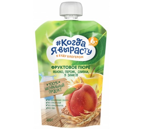 Пюре «Когда Я Вырасту» Яблоко-персик-сливки-5 злаков — это сбалансированный и полезный детский десерт, рекомендован для питания детей старше 6 месяцев. Пюре — излюбленный перекус не только малышей и деток постарше, но и школьников, подростков, взрослых поддерживающих здоровый образ жизни.