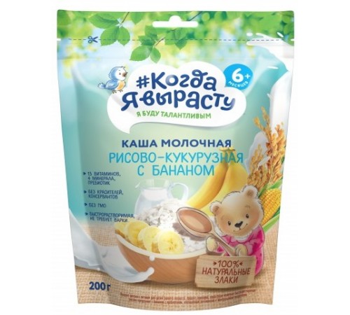 «Когда Я Вырасту» Каша молочная рисово-кукурузная с бананом — это сбалансированный и полезный продукт детского питания, рекомендованный для питания детей старше 6 месяцев. Каша обогащена пребиотиком, для улучшения пищеварения, а так же витаминами и минеральными веществами, так необходимыми малышу в этом возрасте. Каша производится на новейшем современном заводе с соблюдением высоких требований к качеству детского питания.
