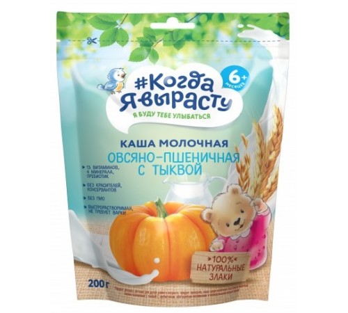 «Когда Я Вырасту» Каша молочная овсяно-пшеничная с тыквой — это сбалансированный и полезный продукт детского питания, рекомендованный для питания детей старше 6 месяцев. Каша обогащена пребиотиком, для улучшения пищеварения, а так же витаминами и минеральными веществами, так необходимыми малышу в этом возрасте. Каша производится на новейшем современном заводе с соблюдением высоких требований к качеству детского питания.