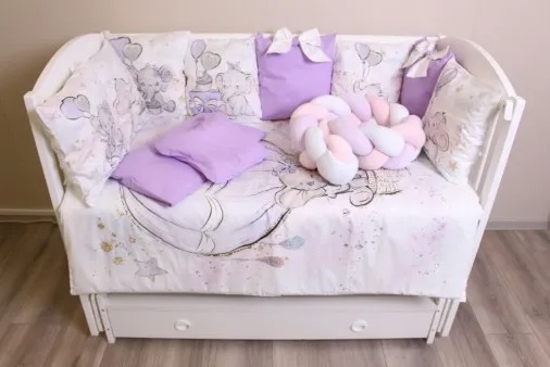 - Бортики по всему периметру кроватки (8 шт.) 60×38 см