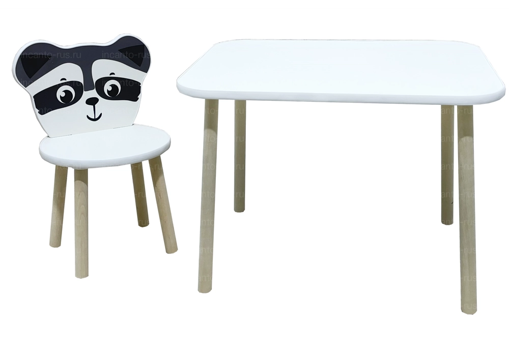 Столешника и стульчик белого цвета, ножки стола и стульчика натурального цвета.