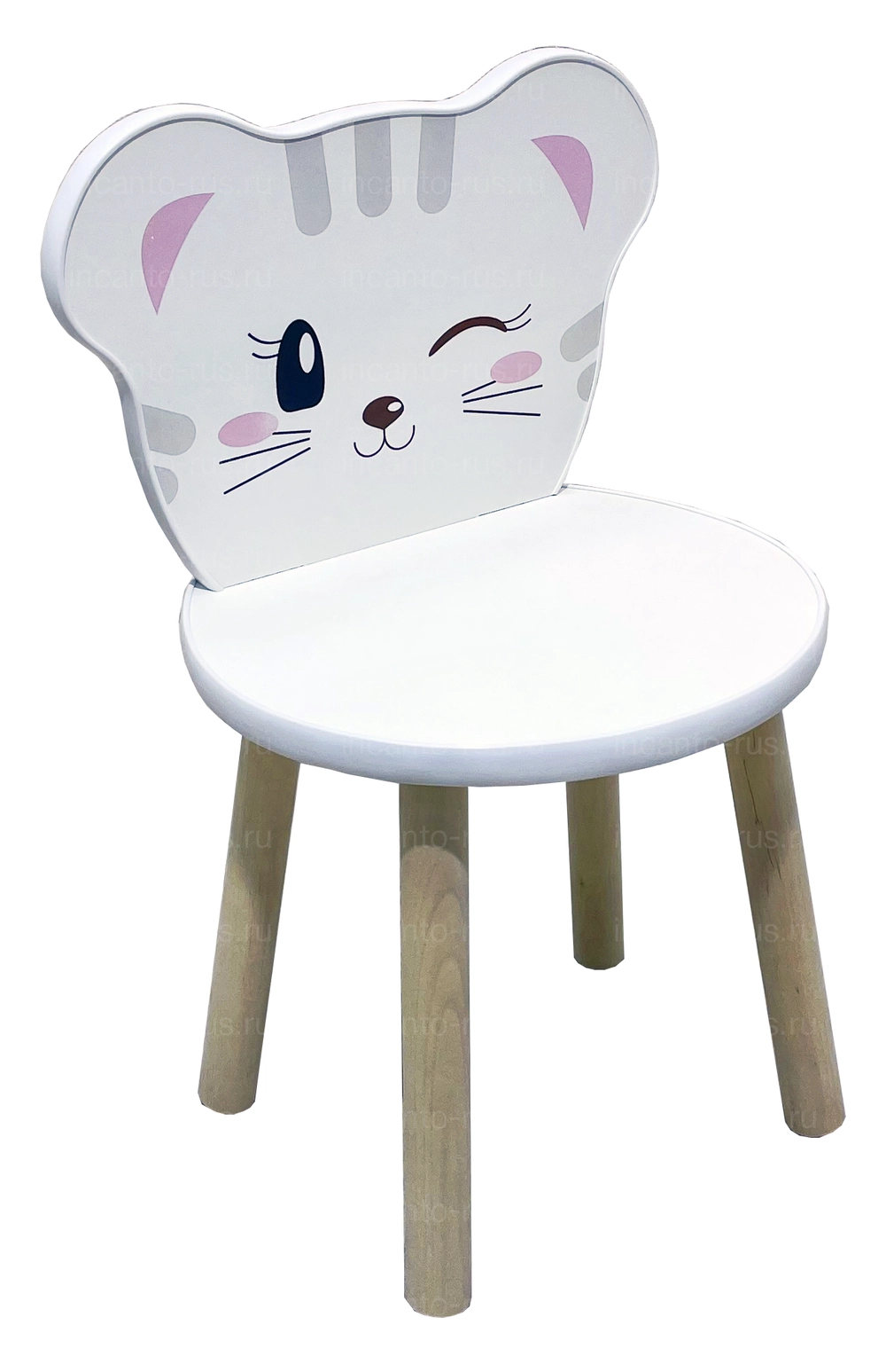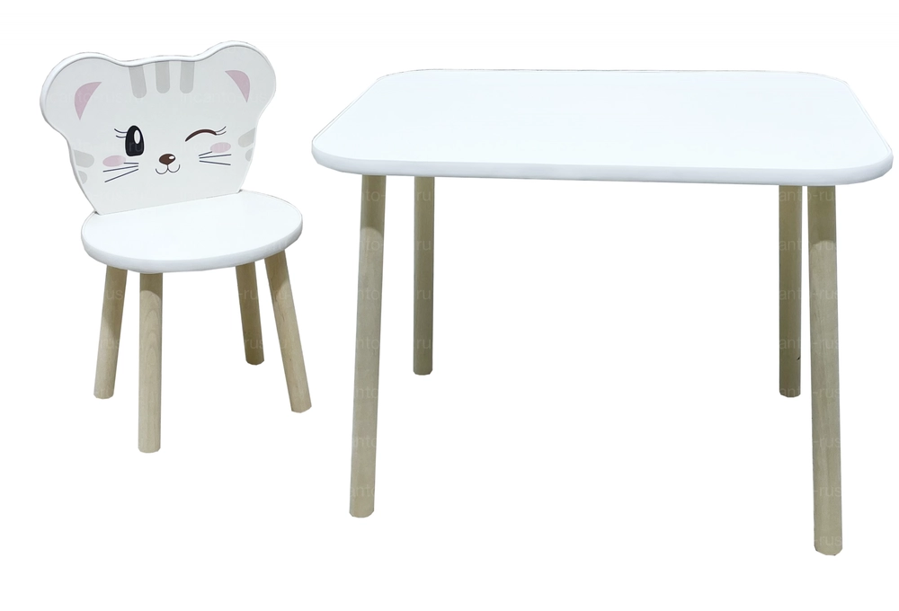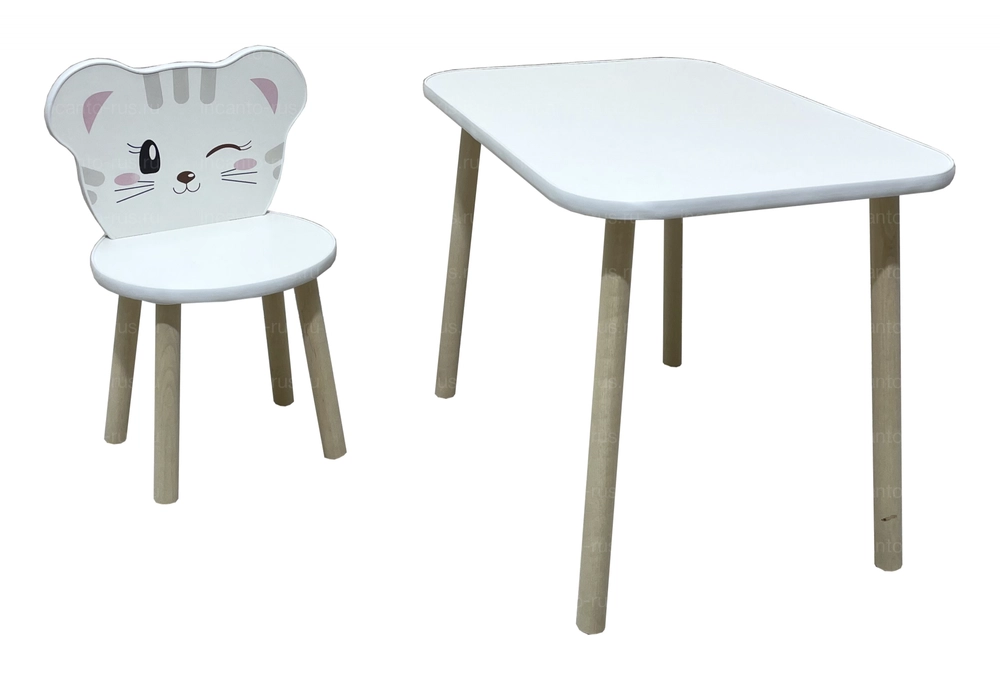 Набор состоит из стола и стульчика, спинка стульчика декорирована милым принтом в виде мордочки котенка.