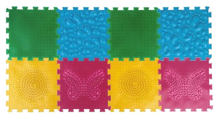 Поверхности набора Первые шаги тренируют и способствуют развитию мышц стопы и голени, а также улучшают кровообращение голеностопного сустава. Массажные поверхности набора обладают тонизирующим воздействием, помогают в правильном формировании свода стопы и препятствуют появлению и развитию ассиметричной ходьбы, что уменьшает риск плоскостопия и положительно влияет на состояние ног в будущем. Дополнительно модульные массажные коврики помогают развивать логическое мышление, мелкую моторику и цветовосприятие.