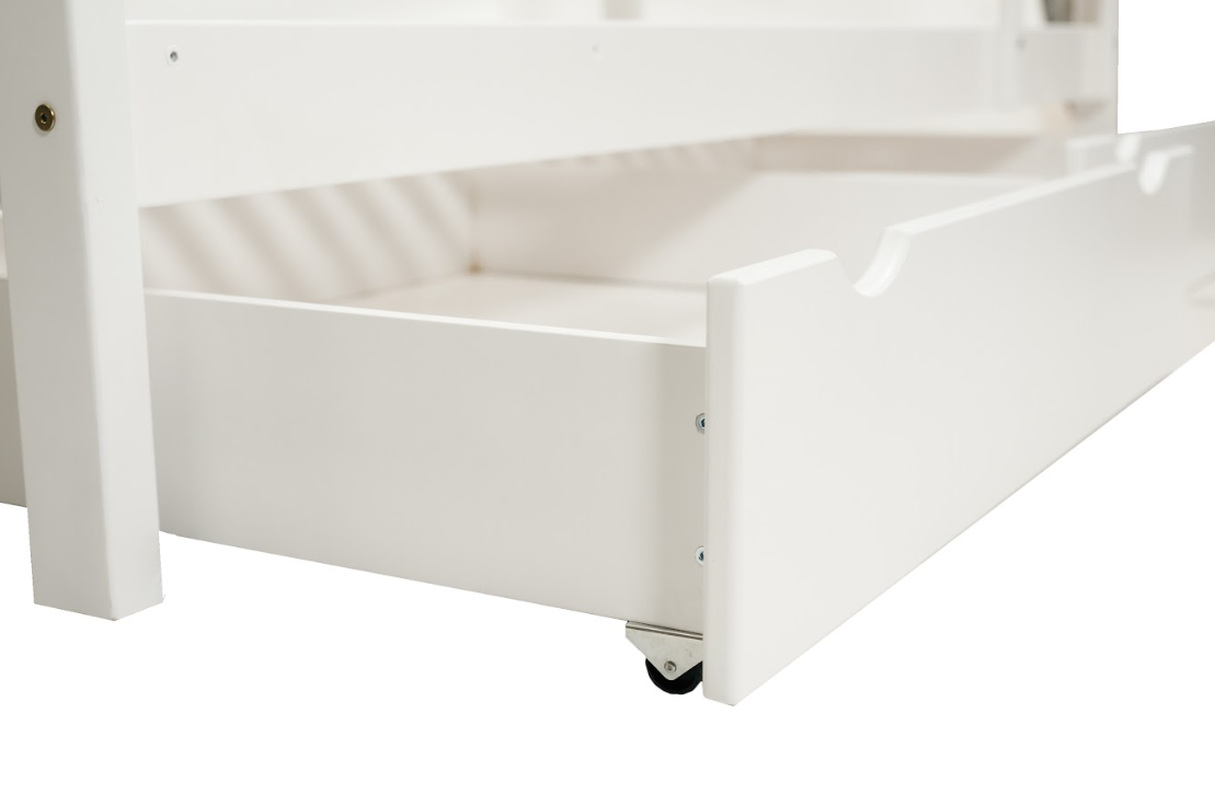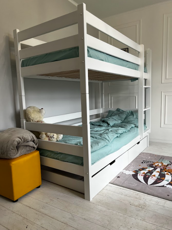 Удобная деревянная кровать имеет привлекательный дизайн и надежную конструкцию. Модель изготовлена из массива дерева бук, тщательно отшлифованного и покрытого экологическим льняным маслом. Под кроватью предусмотрены два больших ящика на колесах для хранения разнообразных вещей, которые также изготовлены из дерева бук.Кровать спроектирована по классической схеме на мебельных винтах. Предусмотрена удобная лестница на второй уровень из четырех ступенек. Второй этаж оснащен предохранителем для безопасности ребенка.