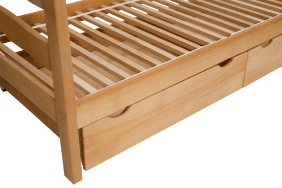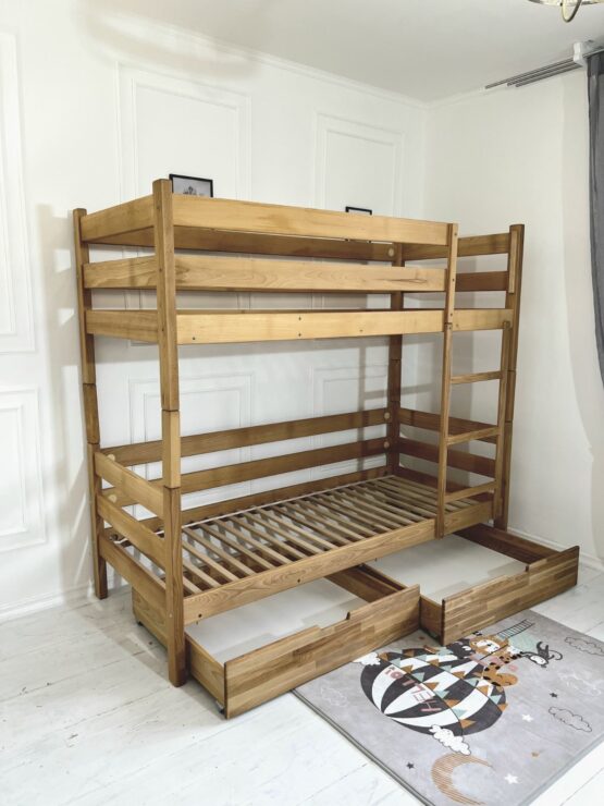 Удобная деревянная кровать имеет привлекательный дизайн и надежную конструкцию. Модель изготовлена из массива дерева бук, тщательно отшлифованного и покрытого экологическим льняным маслом. Под кроватью предусмотрены два больших ящика на колесах для хранения разнообразных вещей, которые также изготовлены из дерева бук.Кровать спроектирована по классической схеме на мебельных винтах. Предусмотрена удобная лестница на второй уровень из четырех ступенек. Второй этаж оснащен предохранителем для безопасности ребенка.