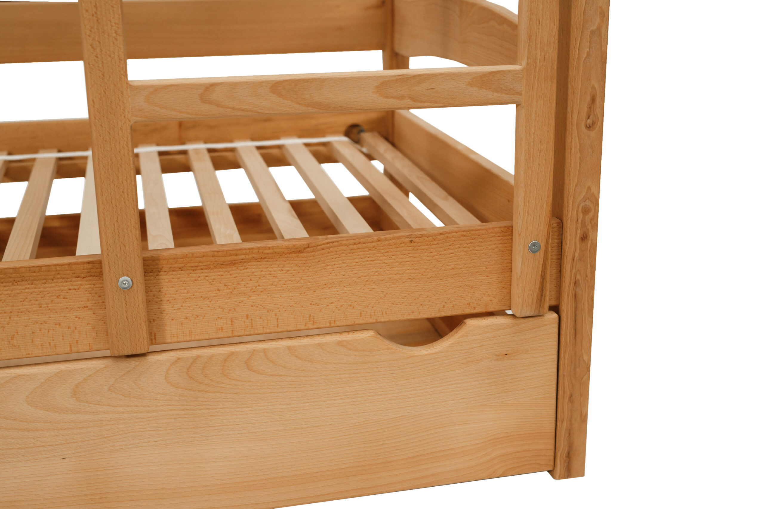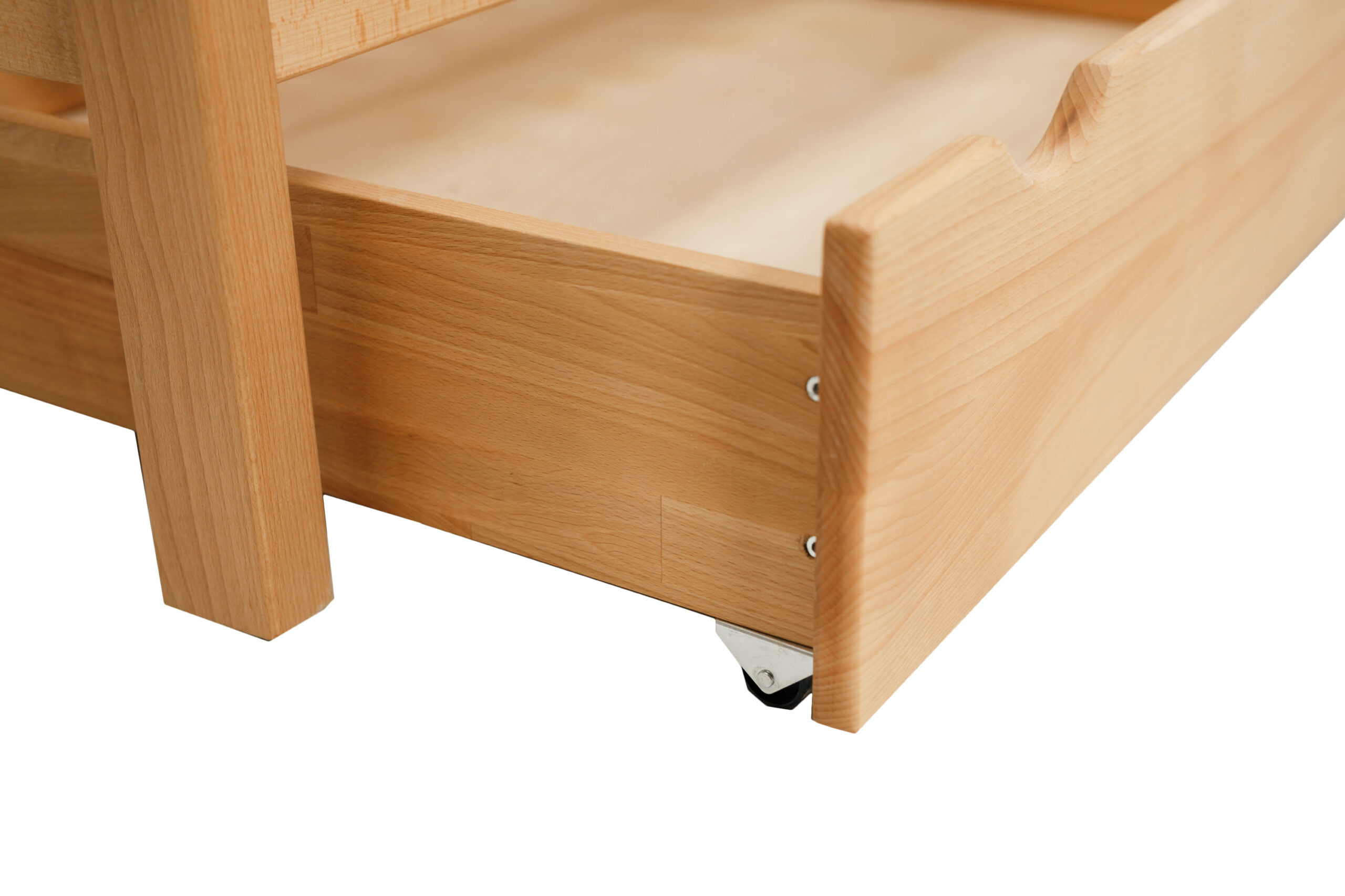 Удобная деревянная кровать имеет привлекательный дизайн и надежную конструкцию. Модель изготовлена из массива дерева бук, тщательно отшлифованного и покрытого экологическим льняным маслом. Под кроватью предусмотрены два больших ящика на колесах для хранения разнообразных вещей, которые также изготовлены из дерева бук.Кровать спроектирована по классической схеме на мебельных винтах. Предусмотрена удобная лестница на второй уровень из четырех ступенек. Второй этаж оснащен предохранителем для безопасности ребенка.