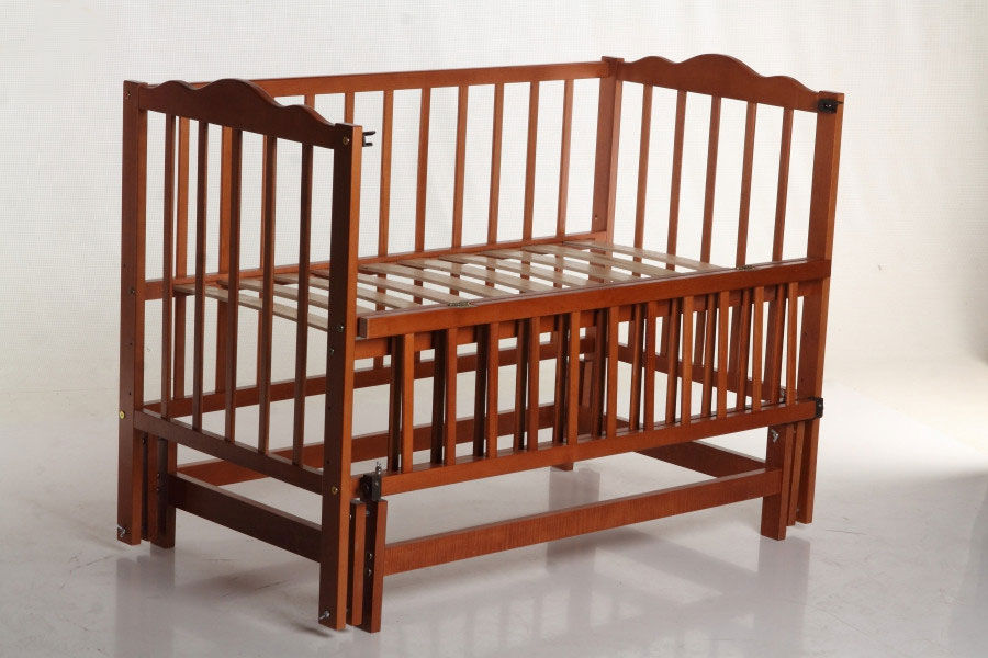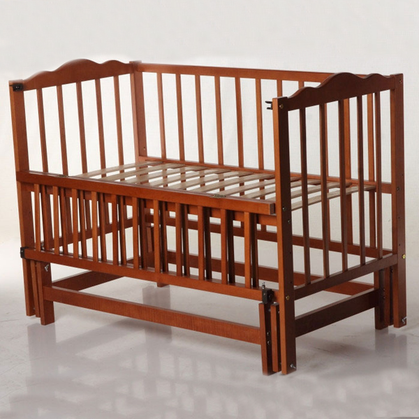 Кроватка для детей из натурального дерева. Буковые ламели гарантируют правильное положение позвоночника ребенка. Маятниковый механизм качания выполнены из безопасного материала.