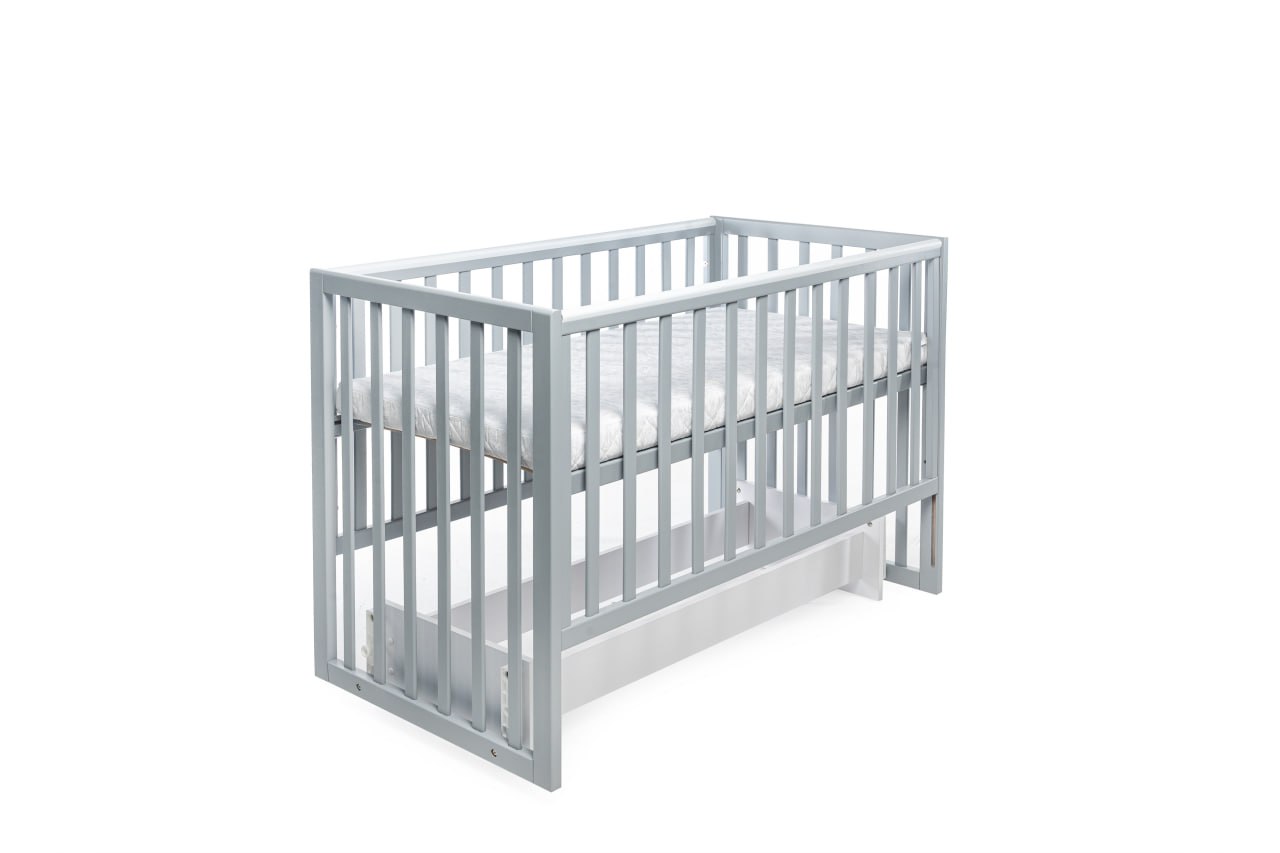 Кроватка имеет маятниковый механизм поперечного качания с фиксатором, а также возможность опускания бортика. Высоту спального места можно регулировать на двух уровнях. Все детали имеют безопасные округлые формы, а также бортики с накладками-грызунками.