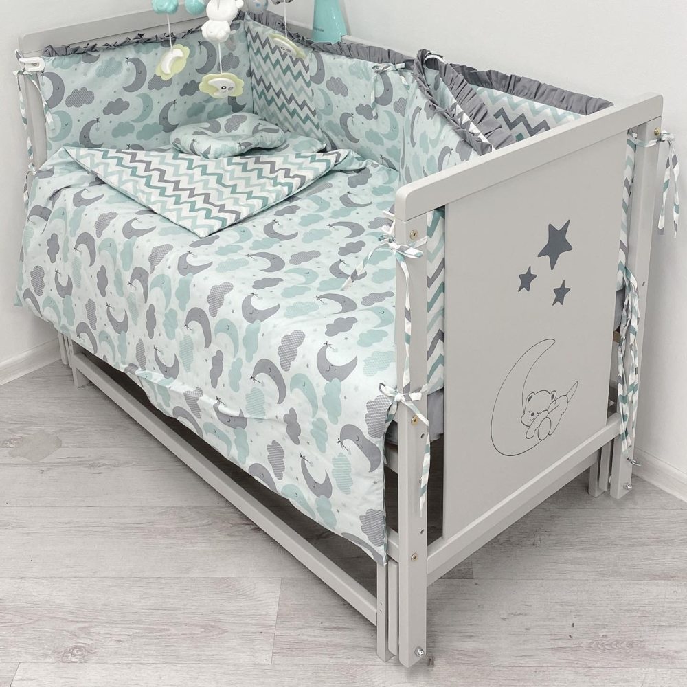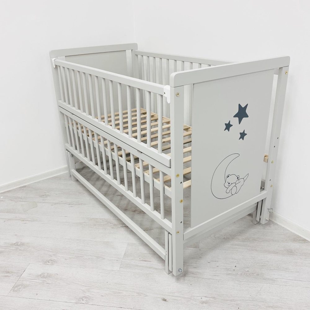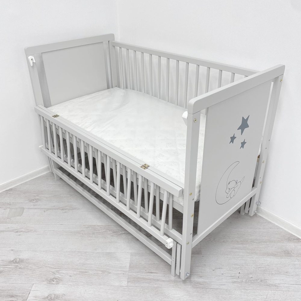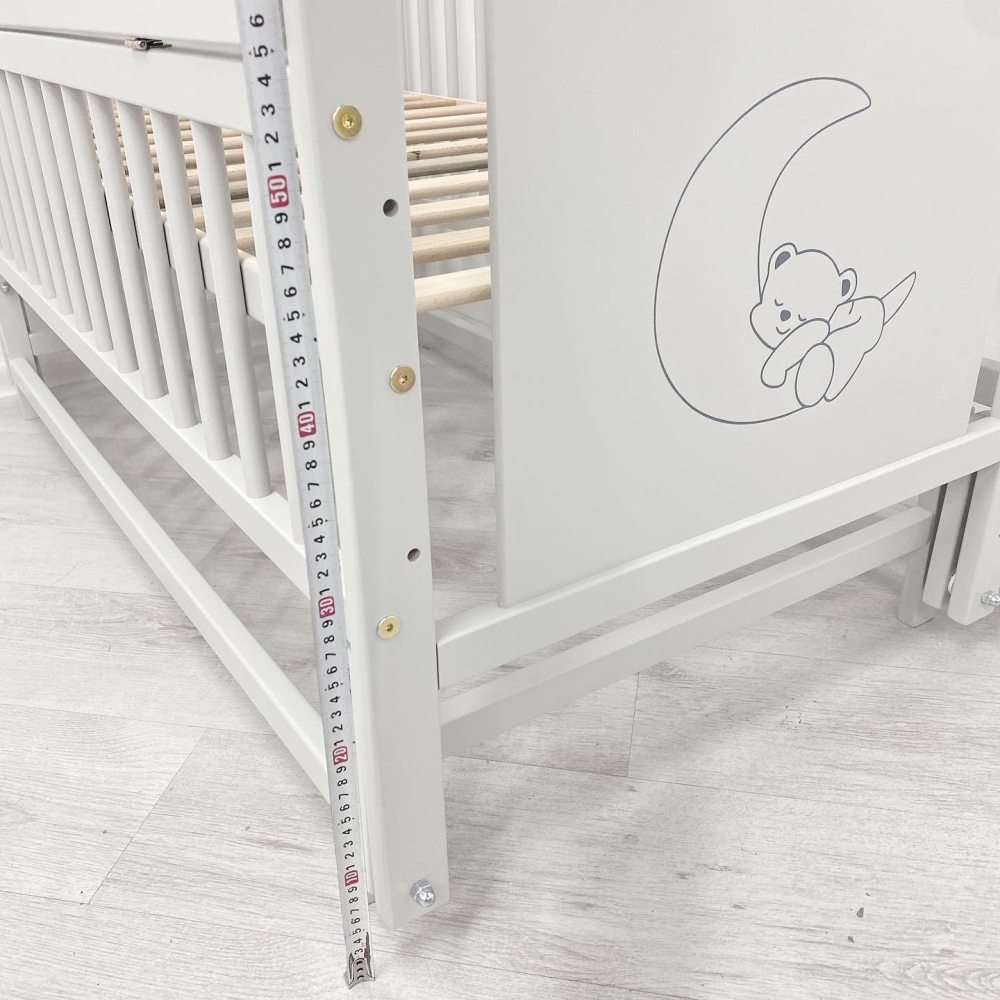 Детская кроватка изготовлена из массива карпатского бука. Передний бортик опускается. Это позволяет маме с легкостью контролировать сон малыша. Защелки для крепления верхней части бортика к кроватке сделаны из плотного пластика и очень хорошо крепятся. Дно кроватки выполнено из деревянных ламелей. Они обеспечивают прочность и упругость. Матрас хорошо проветривается и выполняет ортопедические функции.