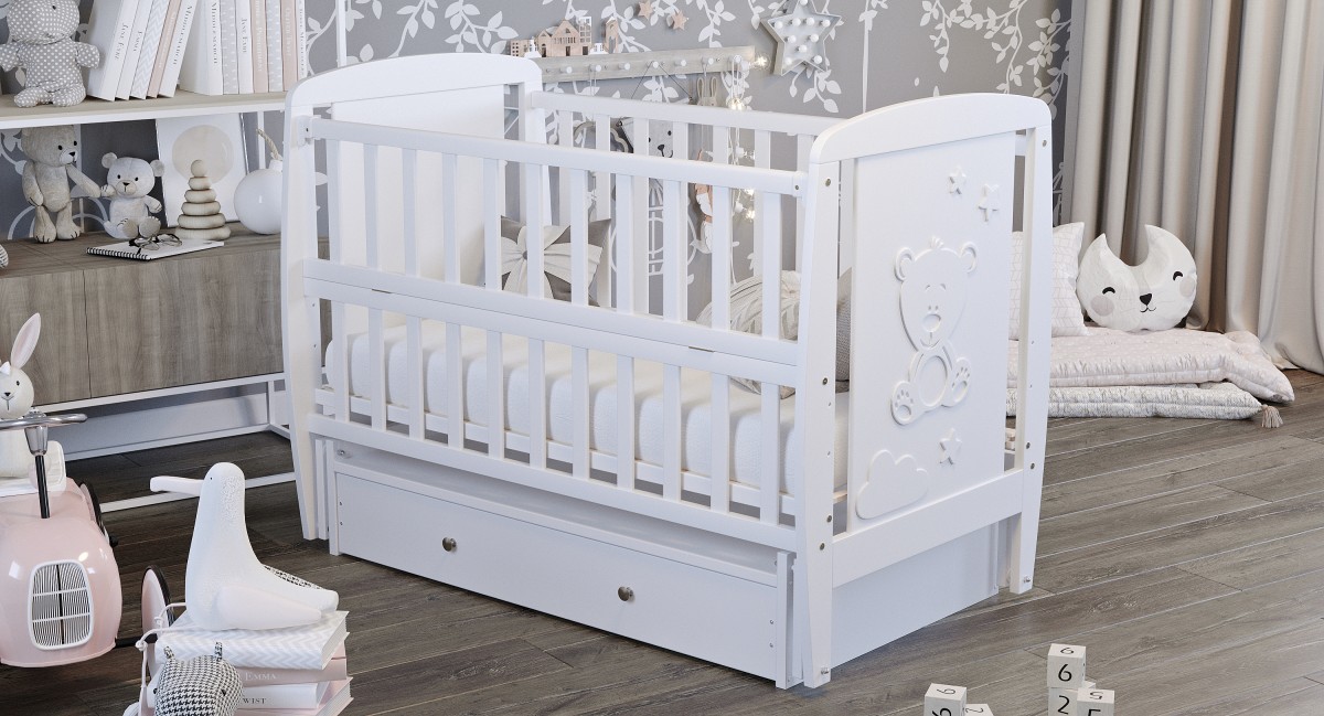 Детская кроватка изготовлена из массива карпатского бука. Передний бортик опускается. Это позволяет маме с легкостью контролировать сон малыша. Защелки для крепления верхней части бортика к кроватке сделаны из плотного пластика и очень хорошо крепятся. Дно кроватки выполнено из деревянных ламелей. Они обеспечивают прочность и упругость. Матрас хорошо проветривается и выполняет ортопедические функции.
