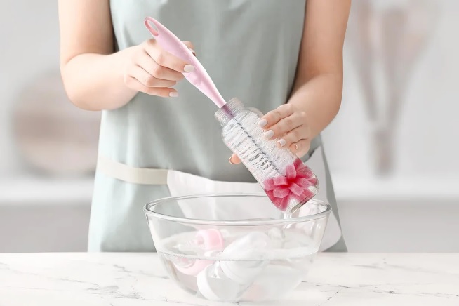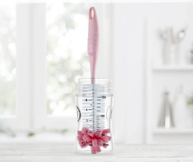 Щетка для чистки детских бутылочек с очень прочной щетиной и губкой на кончике, которая обеспечивает полное мытье и полное удаление остатков пищи даже из труднодоступных уголков.