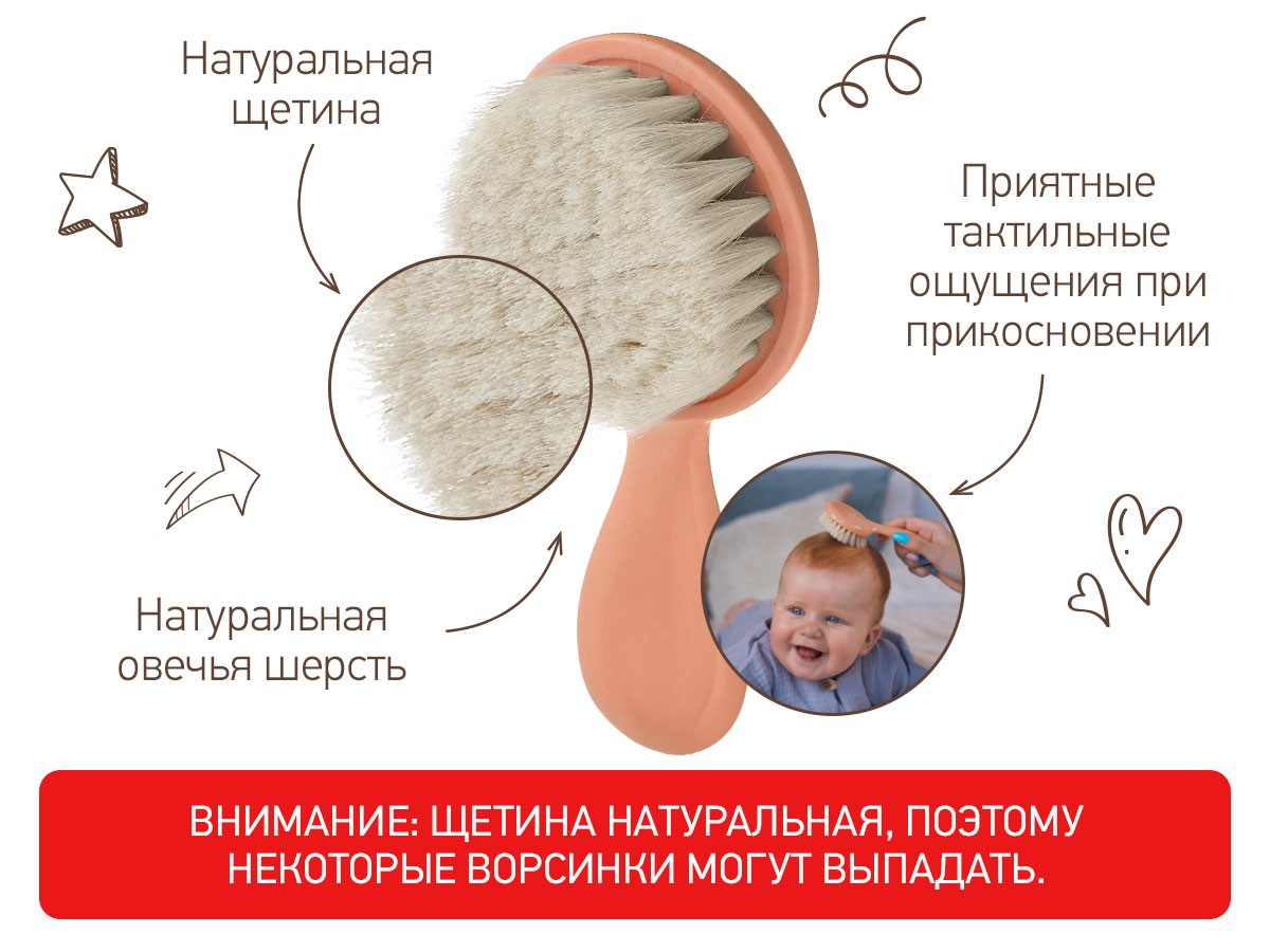 Натуральная щетка из овчины позволит пригладить волосики и придать им аккуратный вид.