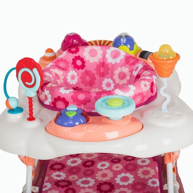 Малыш — это инновационный продукт с вращающимся сиденьем , а игрушки развивают его слуховые, моторные и зрительные навыки . Его можно отрегулировать по трем уровням высоты, чтобы адаптироваться к стадиям роста ребенка.
