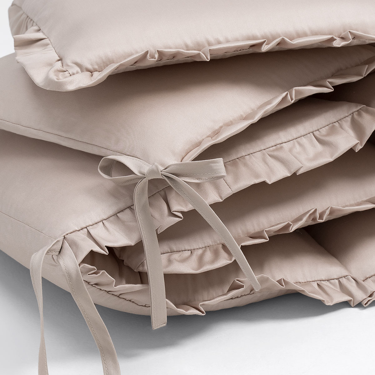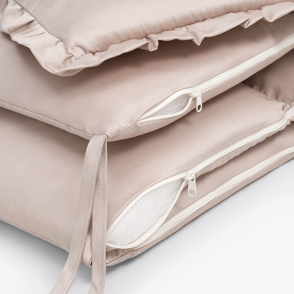 Сатиновая премиальная ткань бортиков хорошо разглаживается после стирки. Благодаря особому способу переплетения хлопковых нитей материал гладкий, как шелк. Сочетание натурального хлопка и воздушного гипоаллергенного наполнителя Холлкон обеспечивает еще одно полезное свойство: подушечки хорошо пропускают воздух и поддерживают температурный баланс.