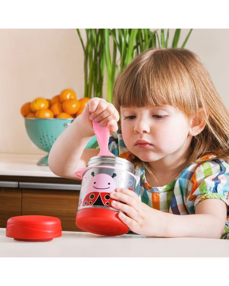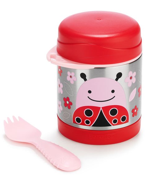 Красочный стальной термос для еды сохранит любимое лакомство вашего ребенка теплым в течение 7 часов или холодным в течение 5 часов. В комплекте с ним идет удобная вилка, комбинированная с ложкой, которая фиксируется на специальном кольце-держателе для приборов. Такой термос очень удобно брать с собой, а веселые персонажи Skip Hop Zoo обязательно порадуют вашего малыша.