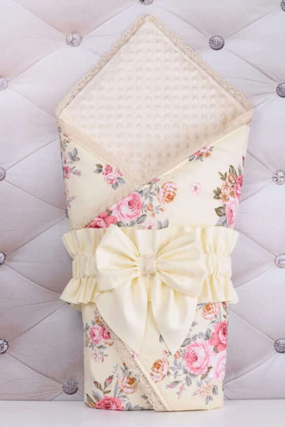 Плед может служить также в качестве конверта на выписку и украшаться резинкой с широкой декоративной рюшей и бантом кремового цвета.