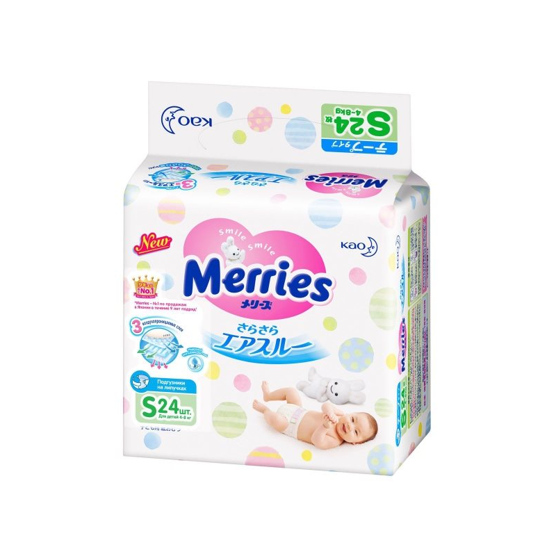 Подгузники Merries размер S (4-8 кг), 24 шт.