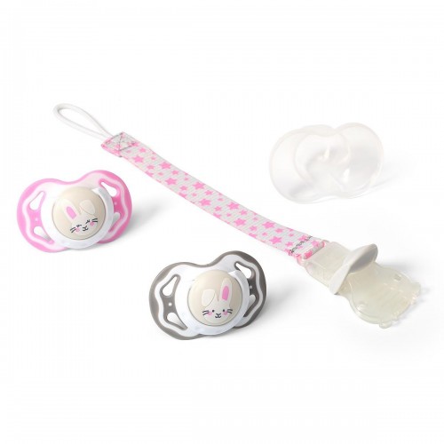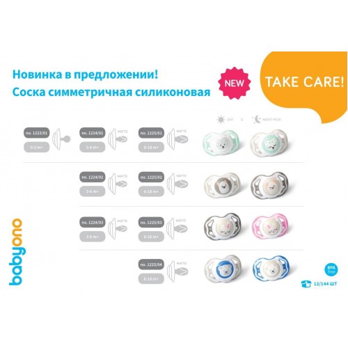 Симметричные пустышки Babyono доступны в следующих размерах: 0-3+: 3-6+, 6-18+. Тип соски должен быть адаптирован к возрасту и индивидуальному развитию ребенка.