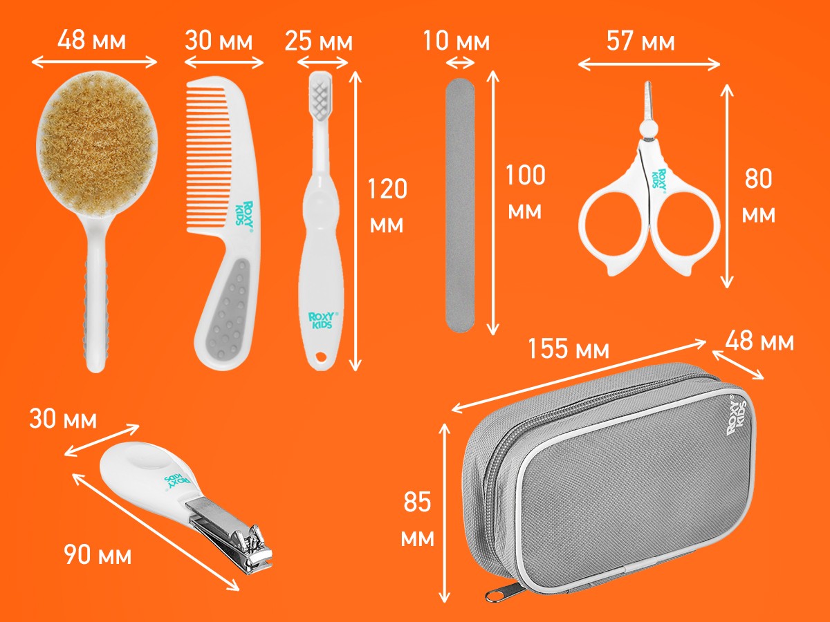 В наборе есть щетка для волос с натуральной щетиной, расческа, маникюрные ножницы, щипчики для ногтей, 4 пилочки, зубная щетка.