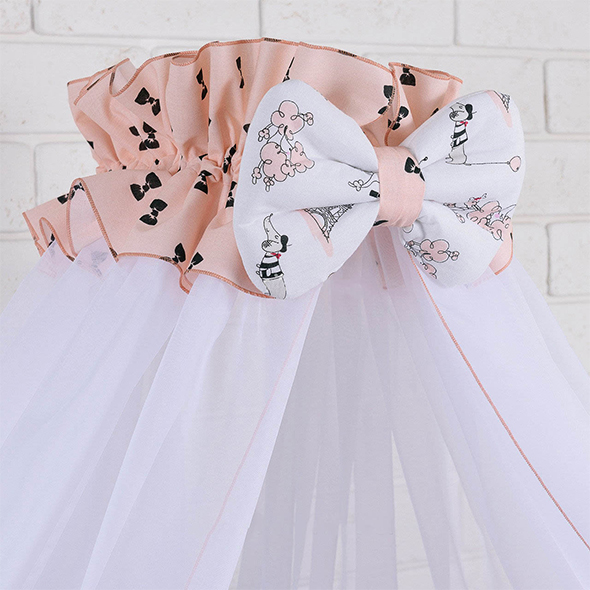 Нежный комплект постельного белья в кроватку «Париж» изготовлен из натуральных, дышащих тканей с тремя видами принта: с пуделями, сердечками и бантами.
