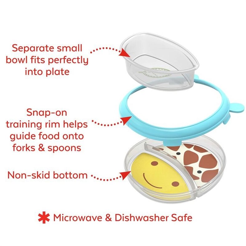 Тарелочка в виде харизматичных персонажей Skip-Hop состоит из 2-х секций. Съемный ободок, закрывающий тарелку по периметру и противоскользящее дно не позволят уронить излишки приготовленного мамой ужина. Можно разогревать в микроволновой печи и мыть в посудомоечной машине.