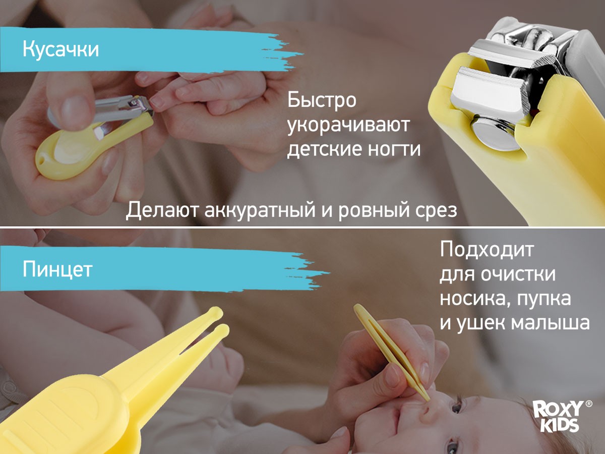 Миниатюрные ножницы идеально подходят для мягких и маленьких ногтей малышей, мелкозернистая пилочка устранит неровности ногтя после стрижки, кусачки помогут выполнить аккуратный и ровный срез ногтя, пинцет подойдет для очистки носика, пупка и ушек малыша.