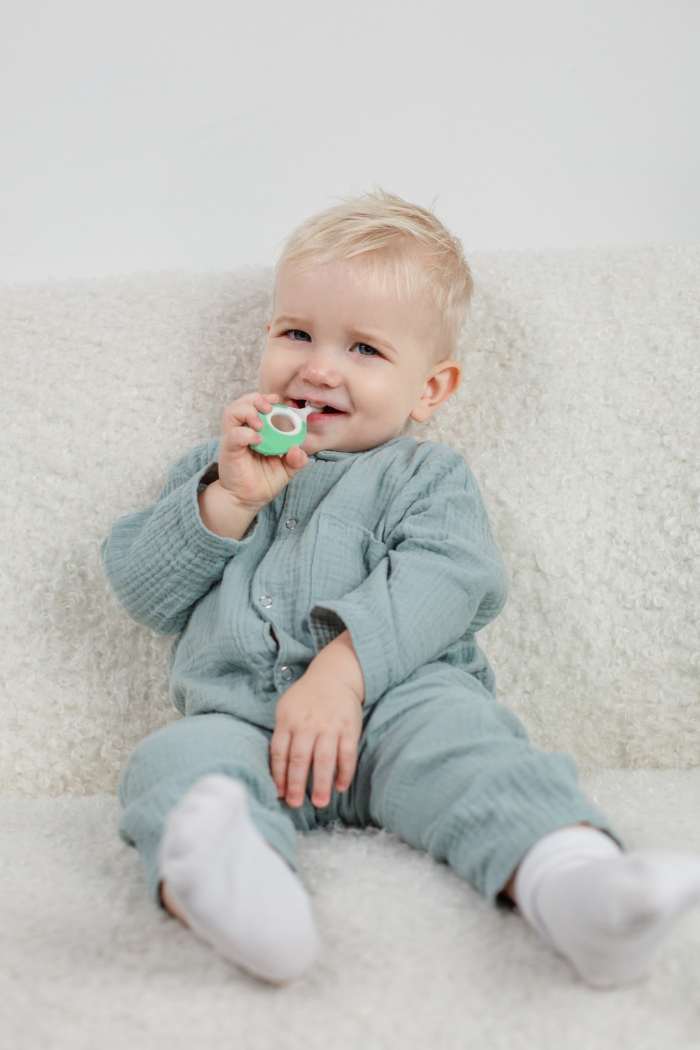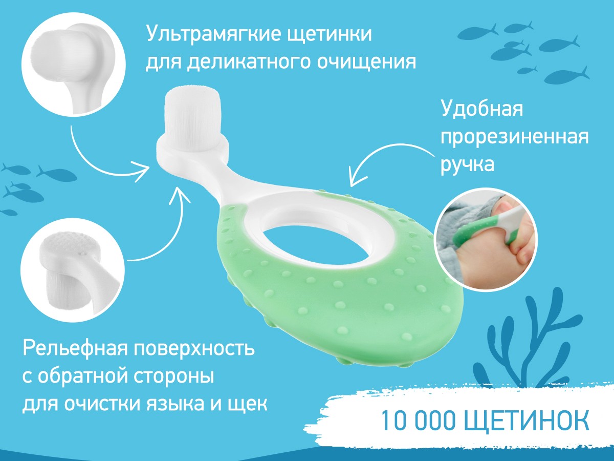 Зубная щетка оснащена небольшой головкой и мягкой щетиной, которая бережно удаляет налет с детских зубов, а также аккуратно массирует десны.
