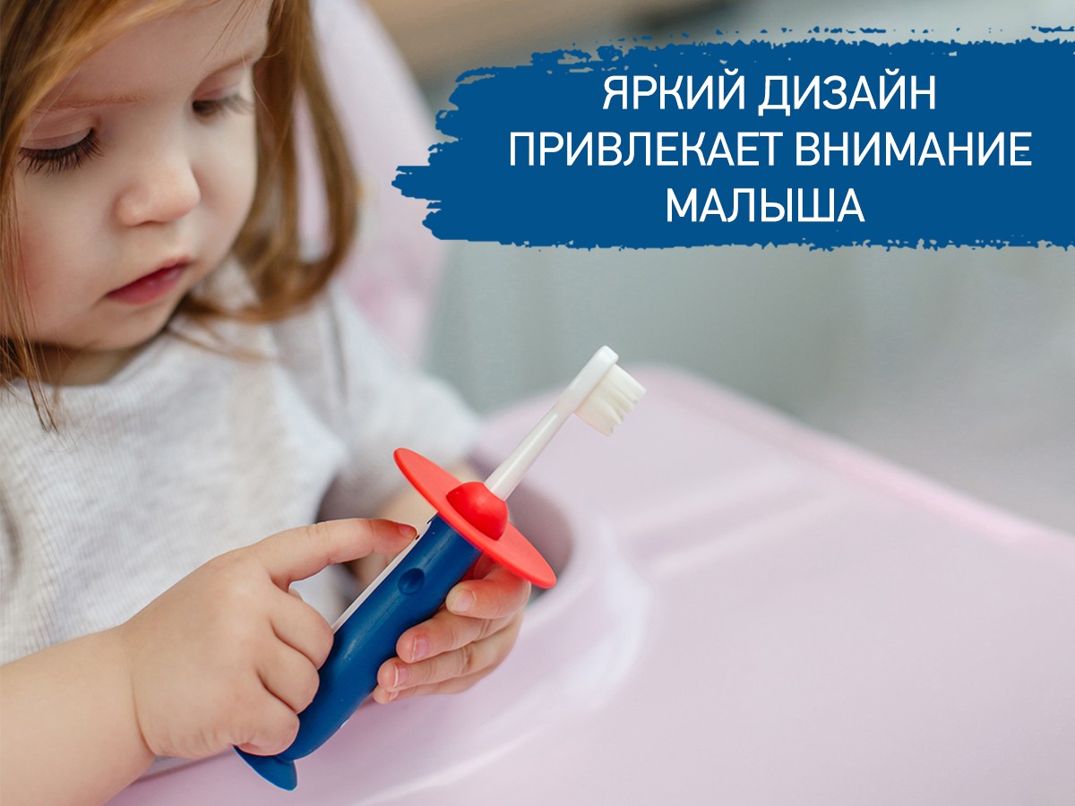 Зубная щетка оснащена небольшой головкой и мягкой щетиной, которая бережно удаляет налет с детских зубов, а также аккуратно массирует десны.