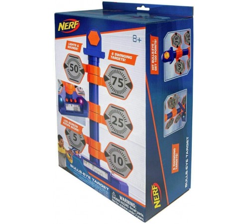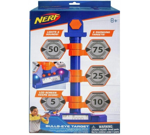 Хватай бластеры и готовься к поражению цели с помощью цифровой мишени Nerf! Оттачивайте свои навыки на высшем уровне и улучшайте свою стрельбу, когда вы стреляете дротиками по 6-ти откидным мишеням и попадите в яблочко получив дополнительные очки! Отдельно стоящая мишень позволяет вам играть в одиночку или соревноваться с друзьями! Цельтесь по своим мишеням с помощью разных режимов игры: Counter Counter, Stack Em и Accuracy Test! ЖК-экран отслеживает результаты и позволяет вам сосредоточиться на соревнованиях и даже сказать вам, кто из вас победил! Цифровая мишень Bulls-Eye — идеальная игрушка, пополни элитную коллекцию Nerf. Стремление к славе еще никогда не было таким захватывающим вместе с цифровой мишенью Nerf Bulls-Eye!