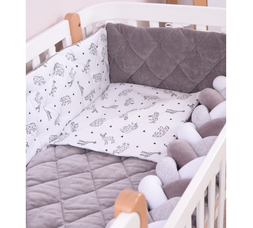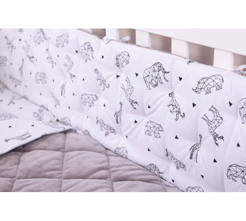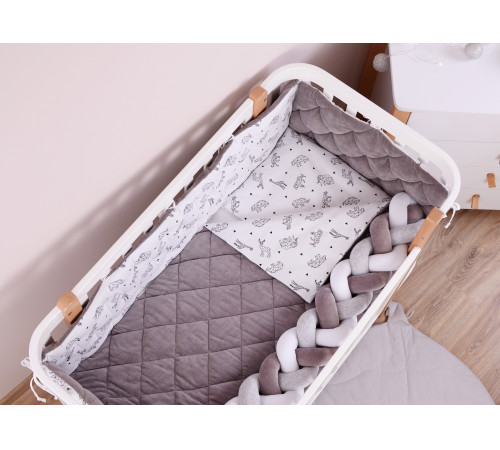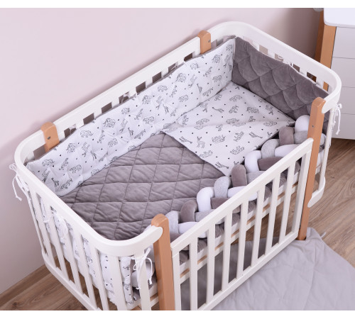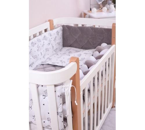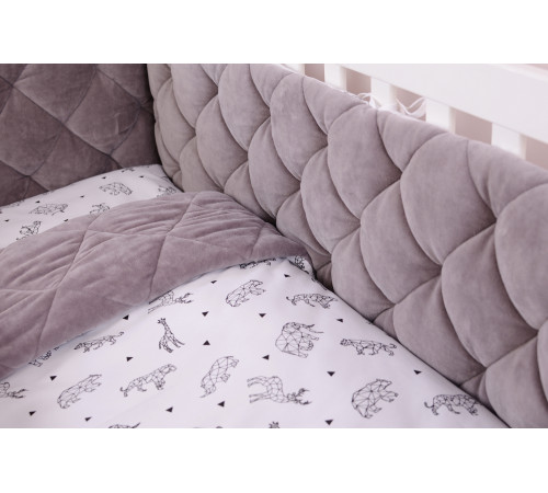 Наполнитель бампера – холлофайбер – гипоаллергенный, хорошо держит форму, а подушки — soft fiber — мягкий и приятный на ощупь, обеспечивает «дышащие свойства», терморегуляцию.
